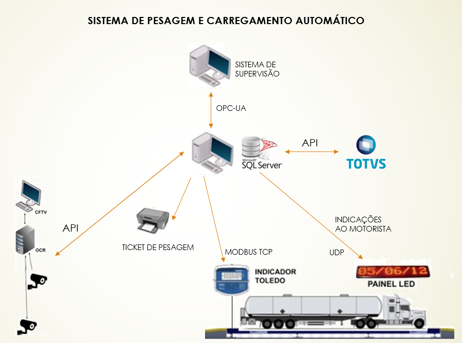 Integrada ao sistema OCR e ERP através de API, e ao sistema de supervisão SDCD/PLC/IHM, controla o carregamento das carretas, realiza análises, registra informações em banco de dados e transmite ao sistema ERP.
